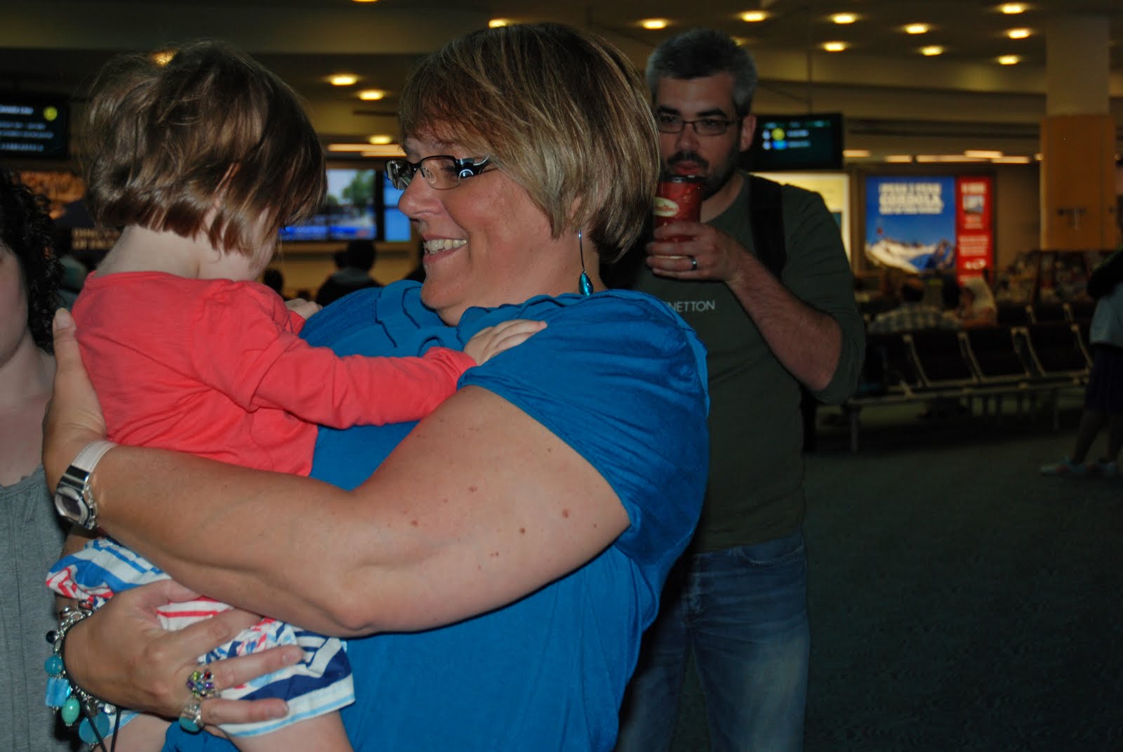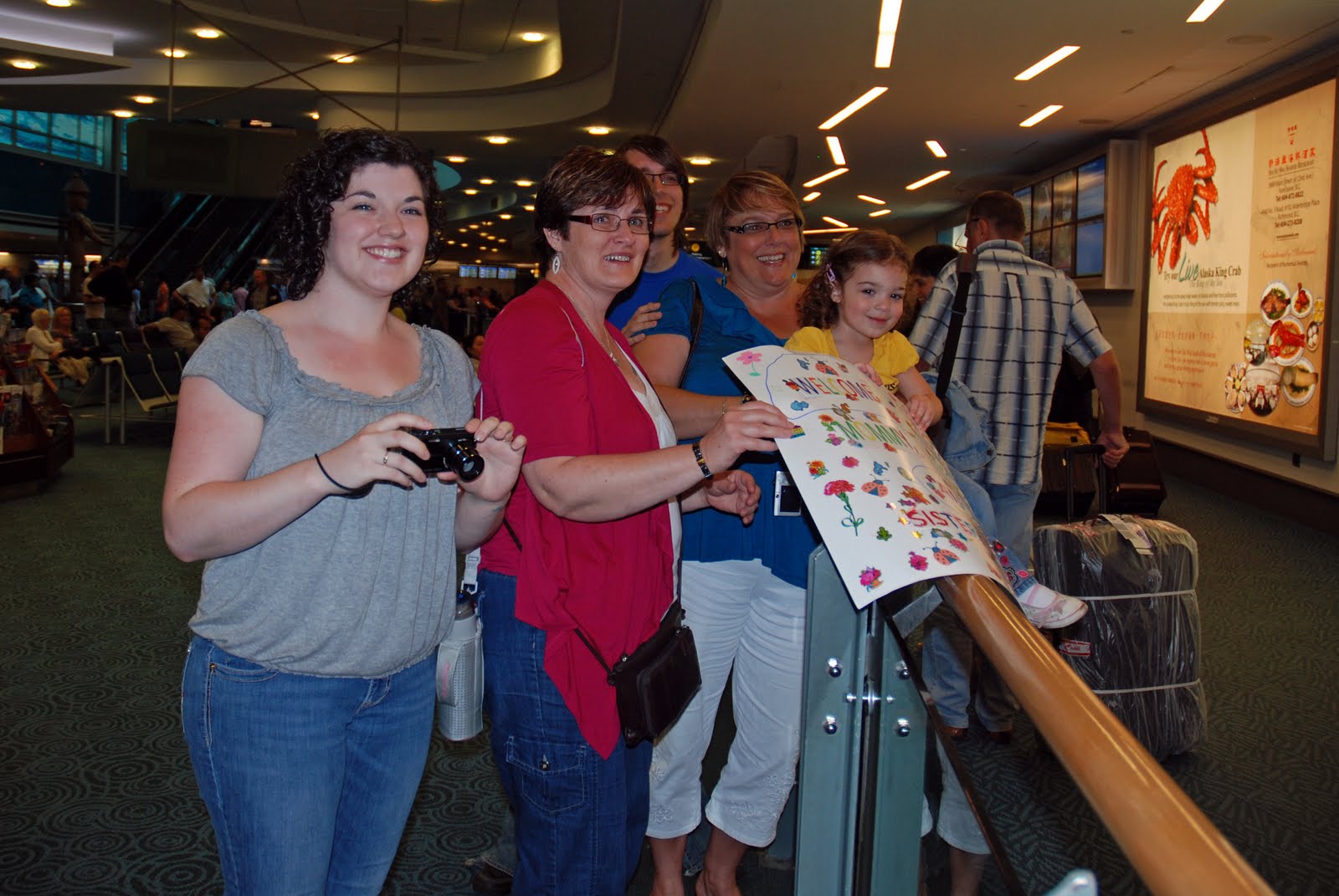 I started crying even before we reached the turn to the meeting area. I was holding Sofie and Jon was pushing the cart. Everyone was at the front of the waiting area. I remember hearing Liz, I think, say “there they are!” I think I started running at this point. Livi was screaming “There’s Mommy and Daddy!” She had a big sign too but I could only see her clearly. She was on the verge of tears too but I think happy tears confused her 🙂 I grabbed her up in my one arm with Sofie in my other. She kept looking at my “wet” face and back at Sofie. Jon was a few short steps behind me and scooped Livi up from me. It was one of the happiest moments of my life. All four of us were together.