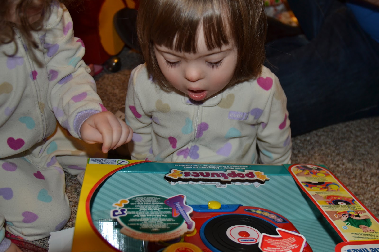 After naps we went to Jon’s mom’s house for a delicious and our only Christmas dinner with all the fixings! Gramma/Jon’s mom makes a rice salad that is more of a desert and a favorite of everyone except Livi. Sofie had her first taste today and loved it! Her eyes got all big, she smiled and signed repeatedly for more! So cute. Sofie ate her weights worth of food and we all left the table amply stuffed. We got to open our presents then! A much loved gift card to my favorite clothing store for me and fancy leather gloves for Jon, along with some money for the family! The girls got spoiled as usual with books, clothes, a huge canister filled with play-doh, molds and tools, and play food for their kitchen set! This is perfect timing because just the same day we saw Sofie showing us her first pretend play skills using a bowl and spoon from the kitchen set! Both girls got pillow pets from their uncle Jeremy but the surprise favorite gift for Sofie was sunglasses! Her face lit up and she wasn’t interested in unwrapping anything else after those!