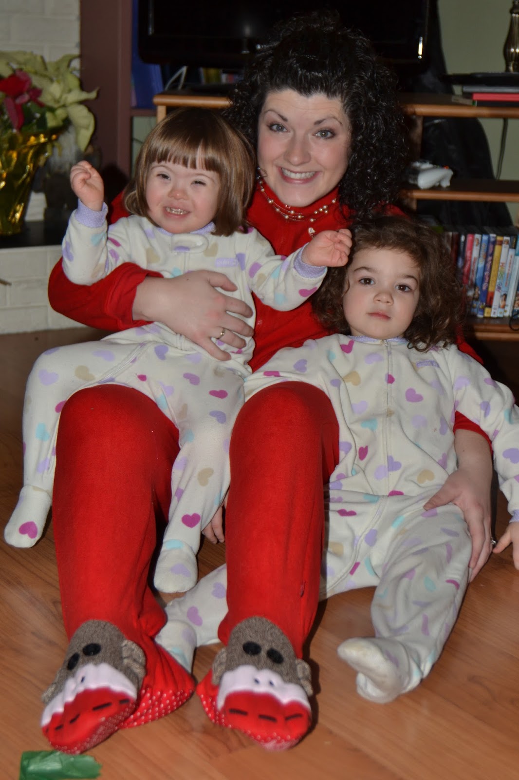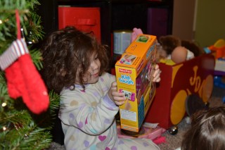 Christmas Eve was a lazy day that we spent mostly in our pajama’s. After a yummy taco dinner we headed off to church which the girls didn’t do to badly at sitting through. It started off a little rough though. Then we drove around looking at the fabulous over the top Christmas houses marked on the tour route in our town. The best house had a projected Santa waving and peering through one of the windows. Livi screamed with glee and waved back! She was so excited the rest of the evening. She put out cookies and water for Santa as well as an orange for Rudolph. I didn’t think she’d fall asleep very easily so I did give her a little melatonin! The best part of the evening was waking her up to the noises of Santa (Daddy) walking on the roof, saying “ho ho ho” and ringing jingle bells! When she came out of her groggy sleep and realized it was the reindeer and Santa she was hearing she was speechless. I wish had recorded her reaction. Her eyes were as wide as I had ever seen him and she screamed with delight at hearing the bells! It was priceless. Truly. We may be horrible parents for doing this though 🙂