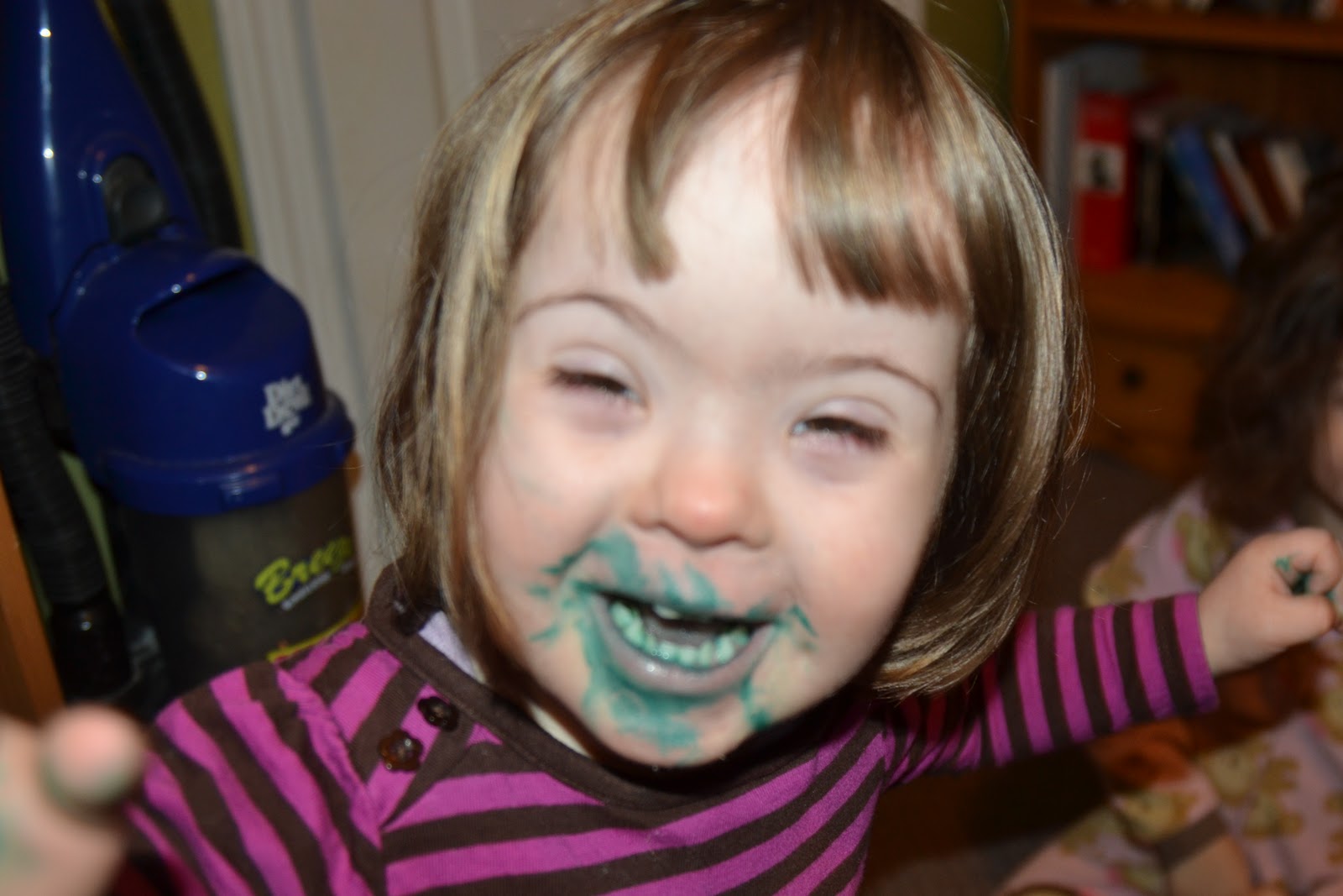 As far as her development she continues to progress. She understands us almost completely even though she was ESL. She wasn’t talking any Bulgarian words when we got her but this is still amazingly fast in my mind. She is a climber. I see broken bones in her future. She can get out of her crib despite her sleep sack. She can follow a few simple two step instructions, like “Pick that up and bring it to Mommy, gentle!” That one gets said a lot and comes after she throws something. She is throwing much less and only hits or pulls hair when she is over-tired or hungry which I try to be careful to not let her get. She is playing with things all time now and frequently even appropriately! Just this week she walked over to the toys in a waiting room, sat down and started playing with the doll house totally appropriately and by herself! No prompting! (Remember she had no idea how to play with anything besides throwing things in the beginning.)
