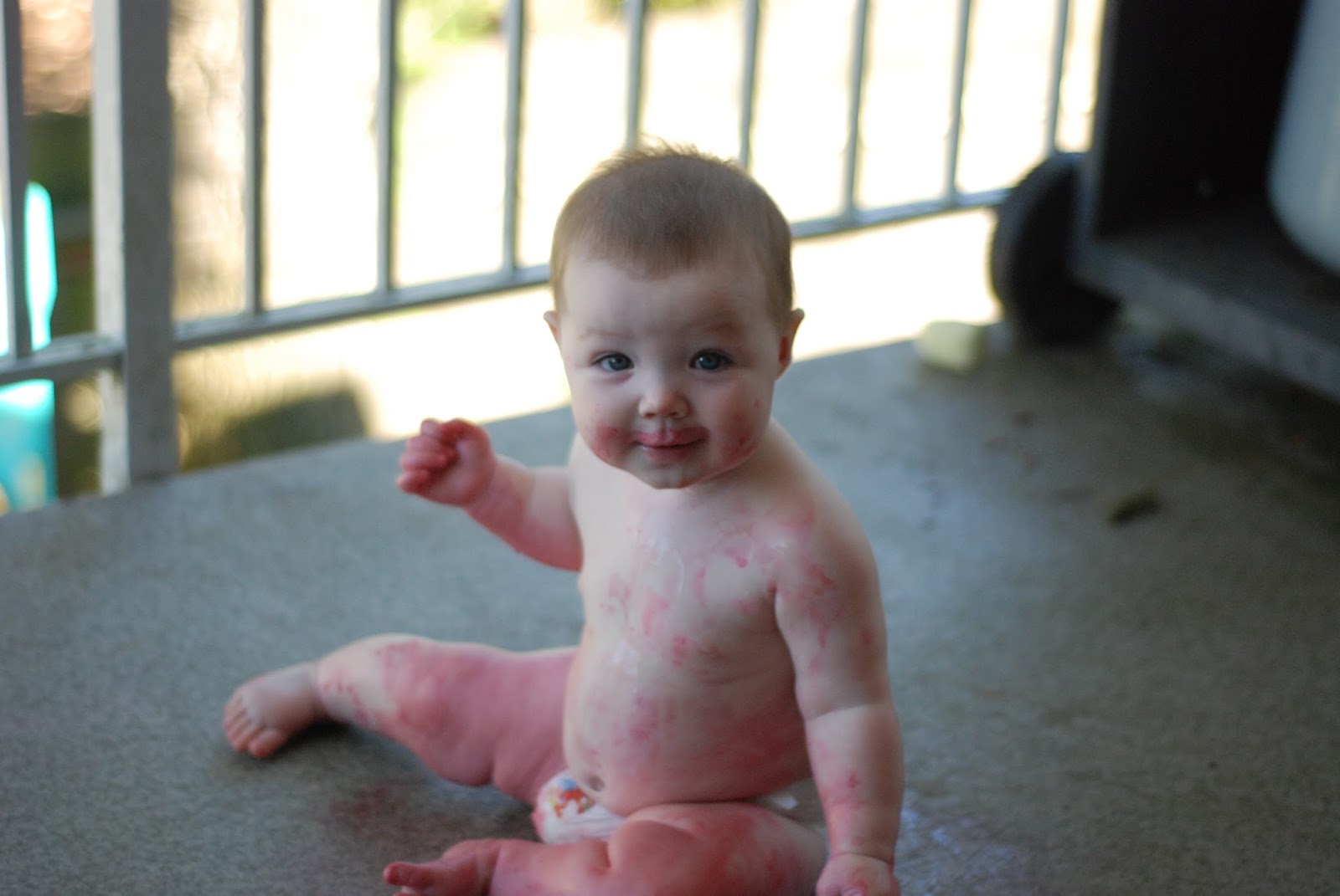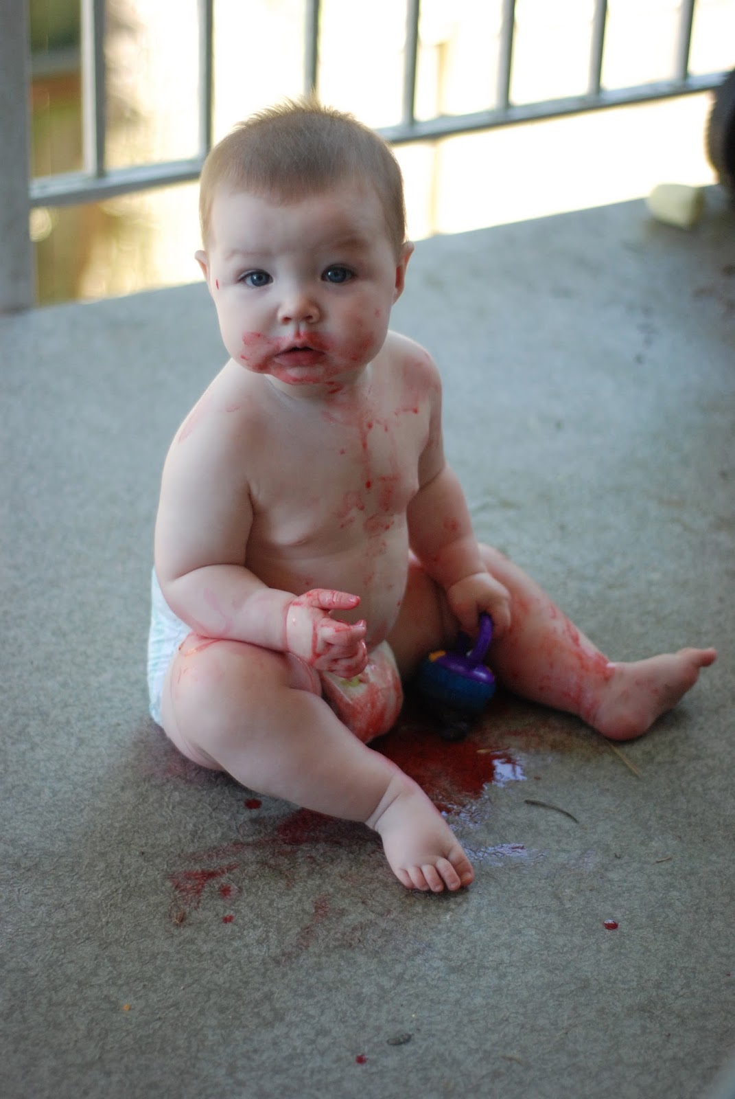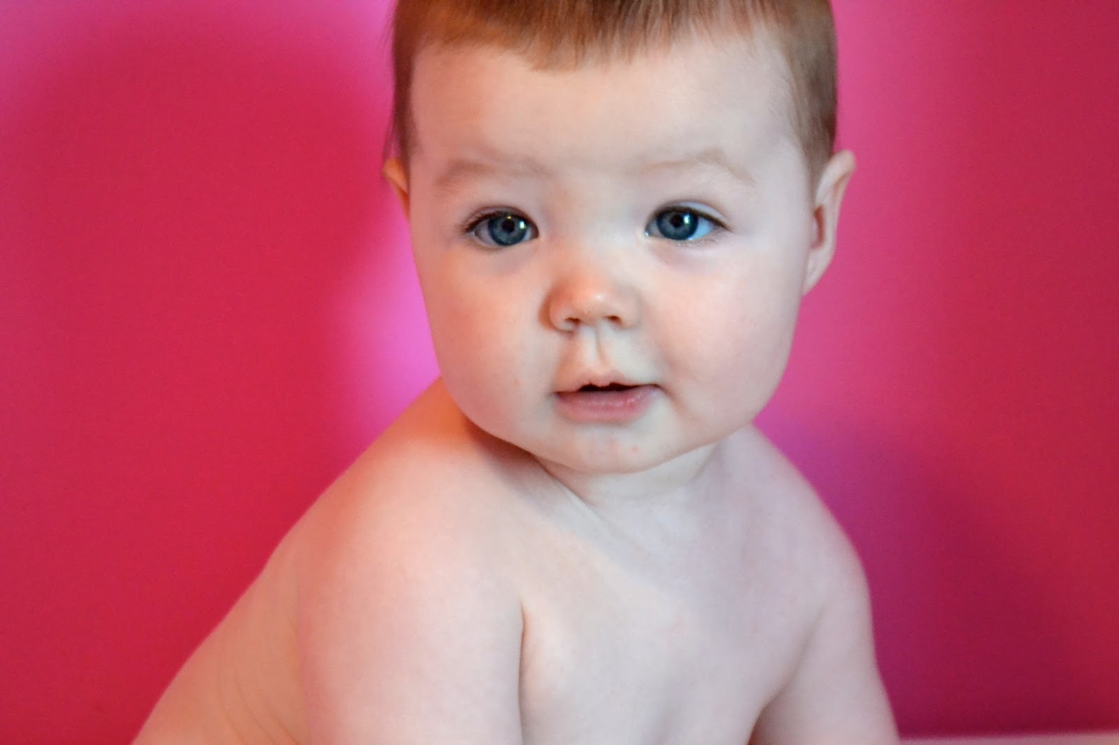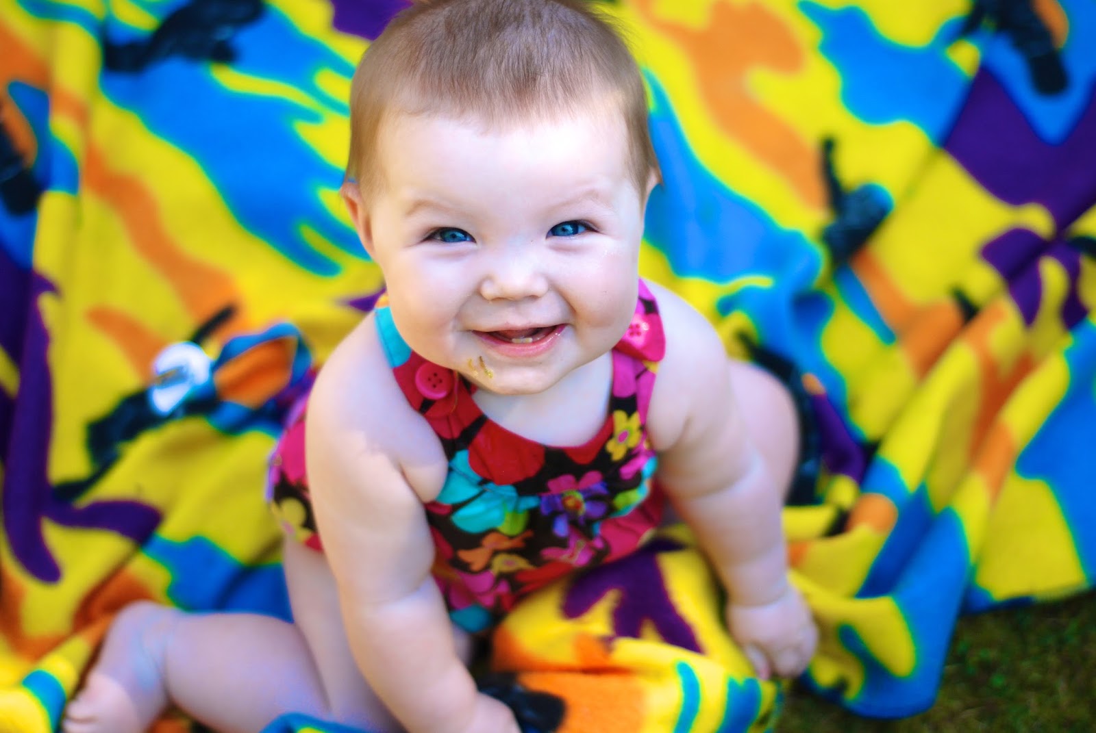 I love that she is keeping her blue eyes. I was sure all my girls would have brown eyes. Her hair is still straight and very fuzzy. She loves being outside. I’ve even stuck her on the patio to quiet her teething whines and she will play for ages.