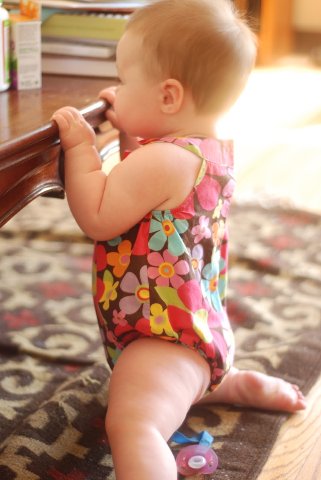 Evie is very much on the move. She army crawls her way all over our main living area and just yesterday was able to push herself up from laying down to sitting. I like that she plays in the toy room now too. I went through all the toys and took any major hazards out so it is mostly safe.